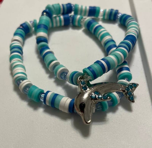 I call this dolphin bracelet "Bubbles". She's so cute! A combination of clay and seed beads. Two bracelets. One with the dolphin charm and one without. Made with clay and seed beads.