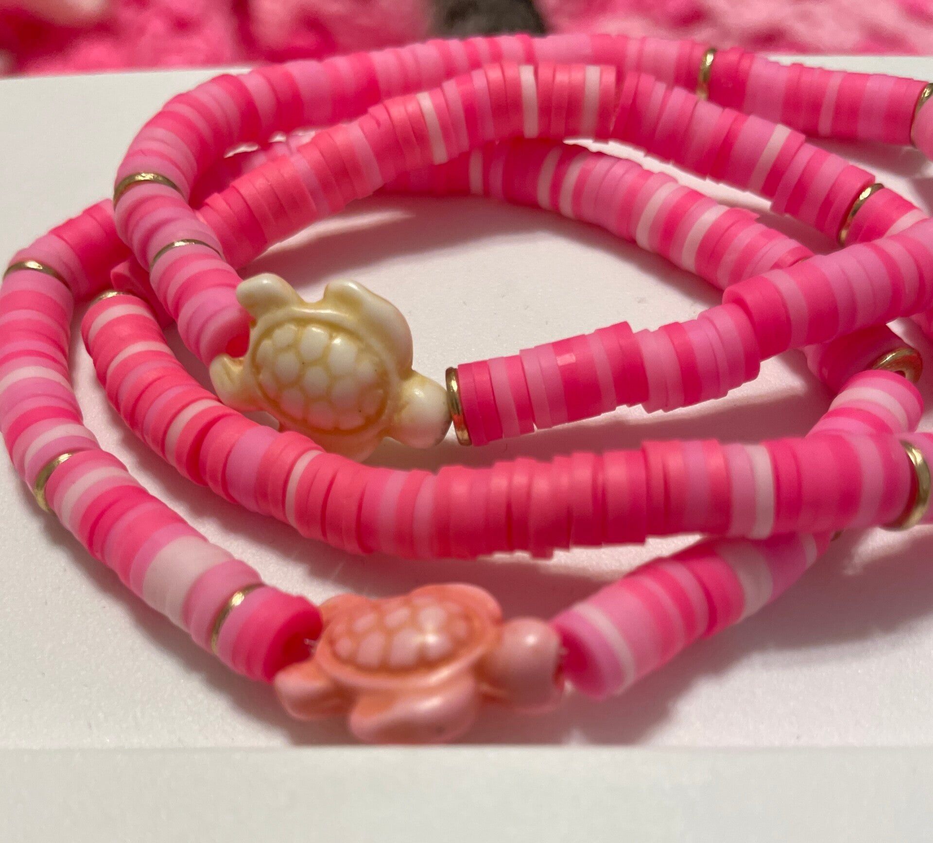 Not one...not two...but three pink sea turtle bracelets! A sweetheart sea turtle charm on two of the bracelets and one plain. Made of polymer clay. The sea turtles are glass.